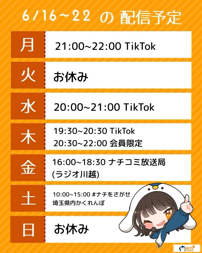 6/16〜6/22の配信予定 配信予定 2025.06.192025.06.23 nachiさんより6/16~6/22の配信スケジュールが公開されましたのでお知らせいたします!ナチサポ会員限定配信が気になった方は是非「ナチサポ」をチェックしてみてください!!