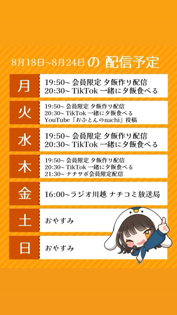 nachiさんより8/18~8/24の配信スケジュールが公開されましたのでお知らせいたします!