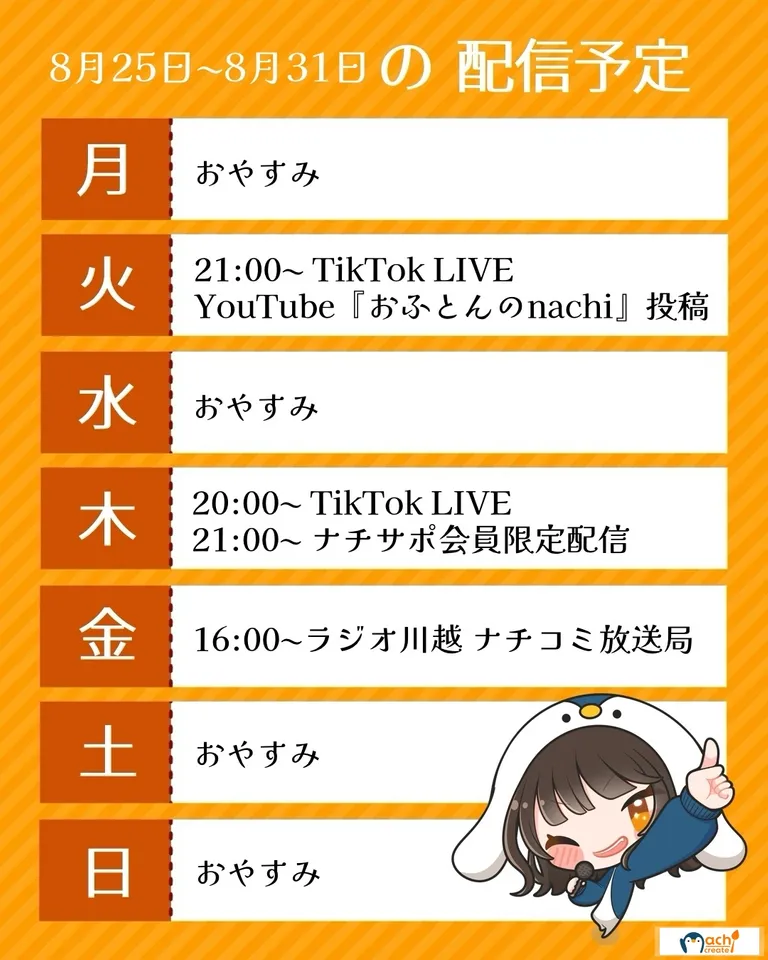 nachiさんより8/25~8/31の配信スケジュールが公開されましたのでお知らせいたします!