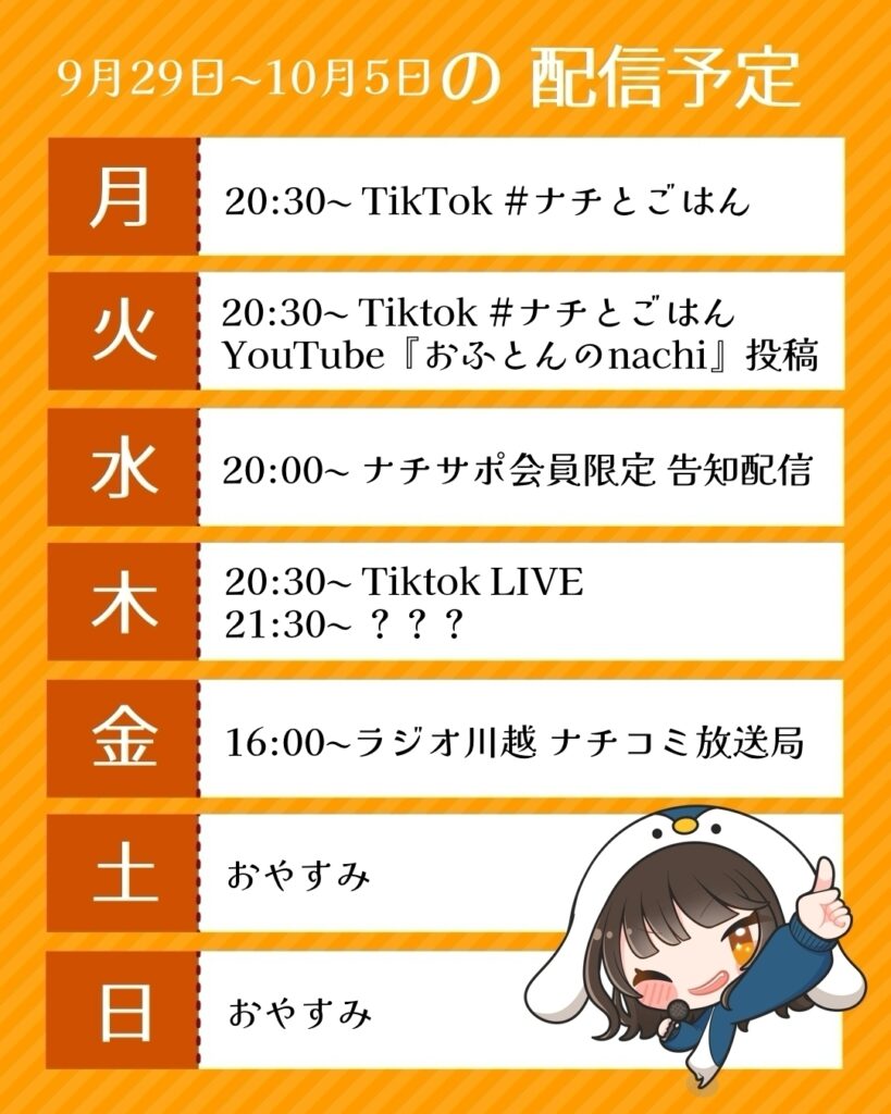 配信予定nachiさんより9/29~10/5の配信スケジュールが公開されましたのでお知らせいたします!